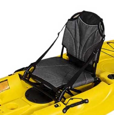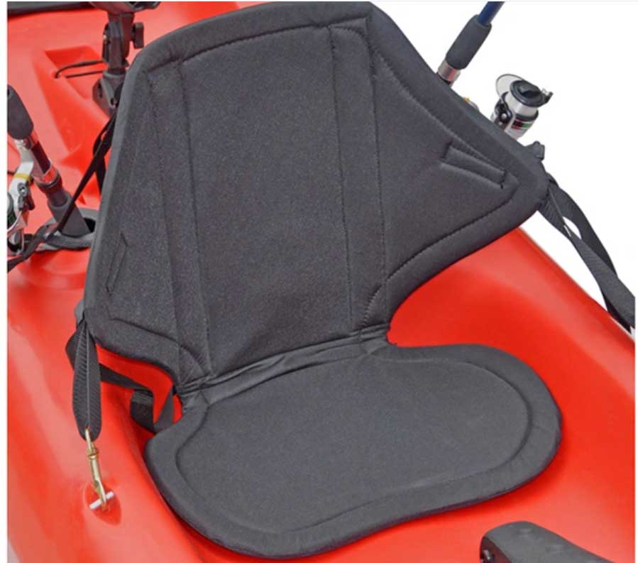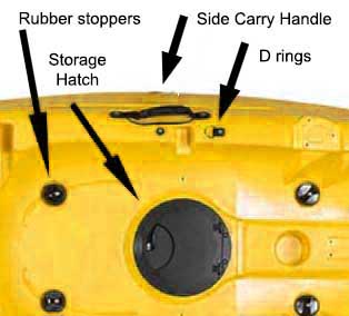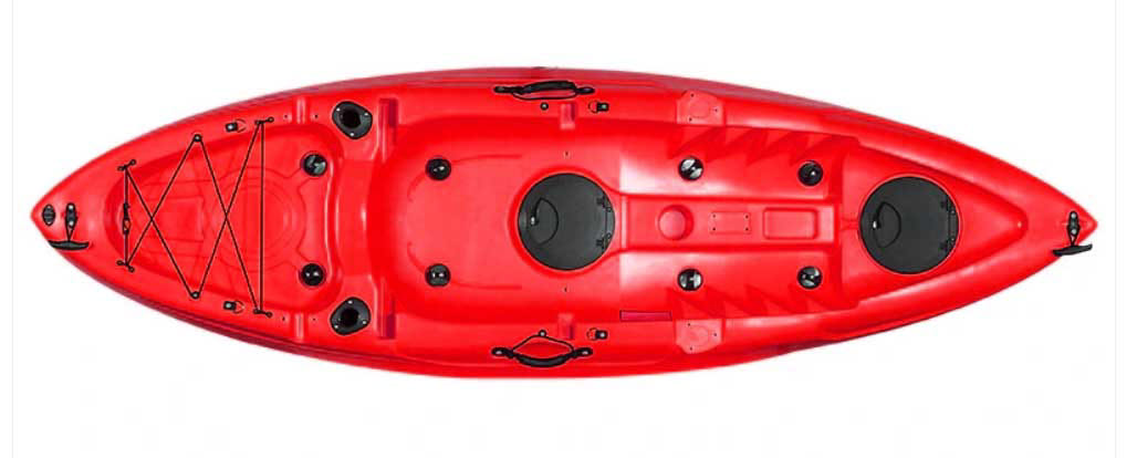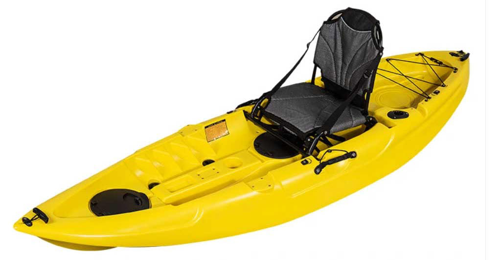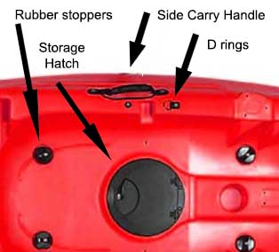The kayak features, bow and stern carrying handles, D ring attachment points, drain plug, rubber stoppers, 8 inch hatch storage in front and back, side carrying handles, black bungee storage area at back, 2 flush mounted rod holders, high back back rest, kayak paddle. The kayak also features the ability to mount a motor bracket and motor, or upgrade to the elite seat.